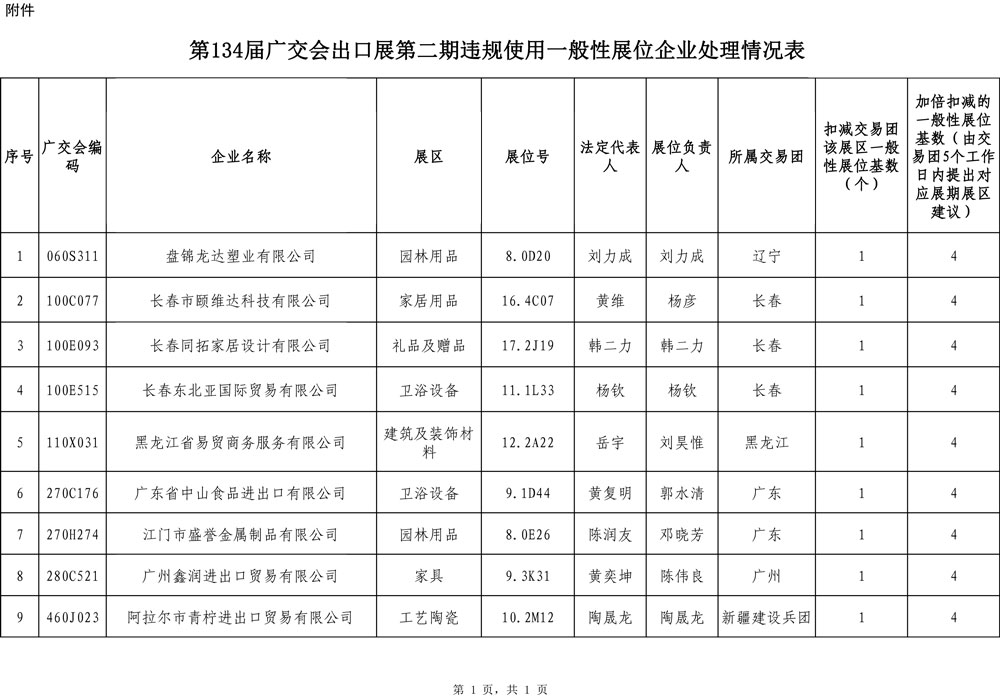 附件:第134屆廣交會出口展第二期違規使用一般性展位企業處理情況表
