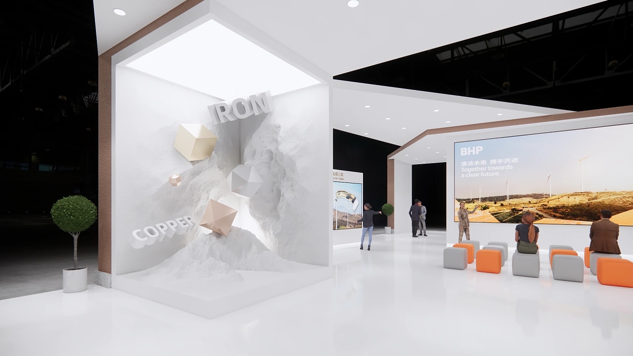 進(jìn)博會BHP展臺面積為120平方展臺,整體使用了大塊的平面進(jìn)行展臺搭建拼接,內(nèi)部使用純白色調(diào)突出展品展示效果,展臺設(shè)計簡潔、現(xiàn)代、立體,體現(xiàn)了參展商環(huán)保、潔凈的產(chǎn)品理念。進(jìn)博會BHP展臺展示空間內(nèi),豐富的圖文和LED大屏墻作企業(yè)文化價值輸出,給人們留下深刻印象。