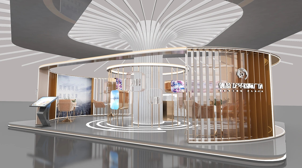 該展臺(tái)面積總共60平,整個(gè)展臺(tái)設(shè)計(jì)都圍繞中間的立柱來(lái)進(jìn)行設(shè)計(jì)搭建,將展臺(tái)分為內(nèi)外兩層,外層為客戶(hù)洽談區(qū),兩邊布置了兩面海報(bào)墻用于展示地產(chǎn)及企業(yè)相關(guān)信息,內(nèi)層通過(guò)高低錯(cuò)落的方形顯示屏幕進(jìn)行戶(hù)型展示,吸引來(lái)往的人流進(jìn)入展臺(tái)內(nèi)進(jìn)行觀(guān)看,整個(gè)展臺(tái)裝修使用了淺棕色作為主色調(diào),盡顯低調(diào)奢華。重慶展覽公司-專(zhuān)業(yè)重慶展臺(tái)搭建,會(huì)展設(shè)計(jì)公司,航峰會(huì)展公司是專(zhuān)注展臺(tái)搭建,展覽搭建,展示搭建,會(huì)展搭建等展覽設(shè)計(jì)搭建服務(wù),連續(xù)多屆進(jìn)博會(huì)展臺(tái)設(shè)計(jì)服務(wù)商,全球數(shù)百家會(huì)展主辦的指定搭建商,多年來(lái)為國(guó)內(nèi)外五百?gòu)?qiáng)提供全球會(huì)展策劃,展覽設(shè)計(jì),會(huì)展設(shè)計(jì),展覽展示設(shè)計(jì),展示設(shè)計(jì),展會(huì)設(shè)計(jì)一站式服務(wù)。通過(guò)展覽制作,會(huì)展制作,展會(huì)制作,展臺(tái)制作,展示制作重塑展示,體驗(yàn),產(chǎn)業(yè),運(yùn)營(yíng)四位一體新展覽之道,激發(fā)企業(yè)品牌創(chuàng)造力,實(shí)現(xiàn)品牌創(chuàng)意營(yíng)銷(xiāo)全球化覆蓋。航峰重慶展覽公司是一家大型重慶展臺(tái)搭建公司專(zhuān)業(yè)從事會(huì)展搭建設(shè)計(jì)等展臺(tái)搭建設(shè)計(jì)服務(wù),同時(shí)提重慶會(huì)展設(shè)計(jì)公司效果圖等會(huì)展搭建設(shè)計(jì)效果圖,高端重慶會(huì)展設(shè)計(jì)公司為企業(yè)提供搭建解決方案。