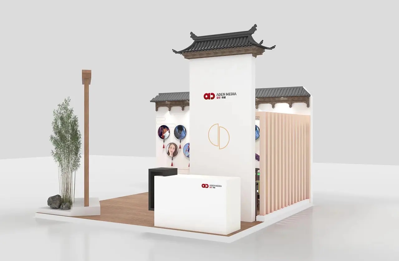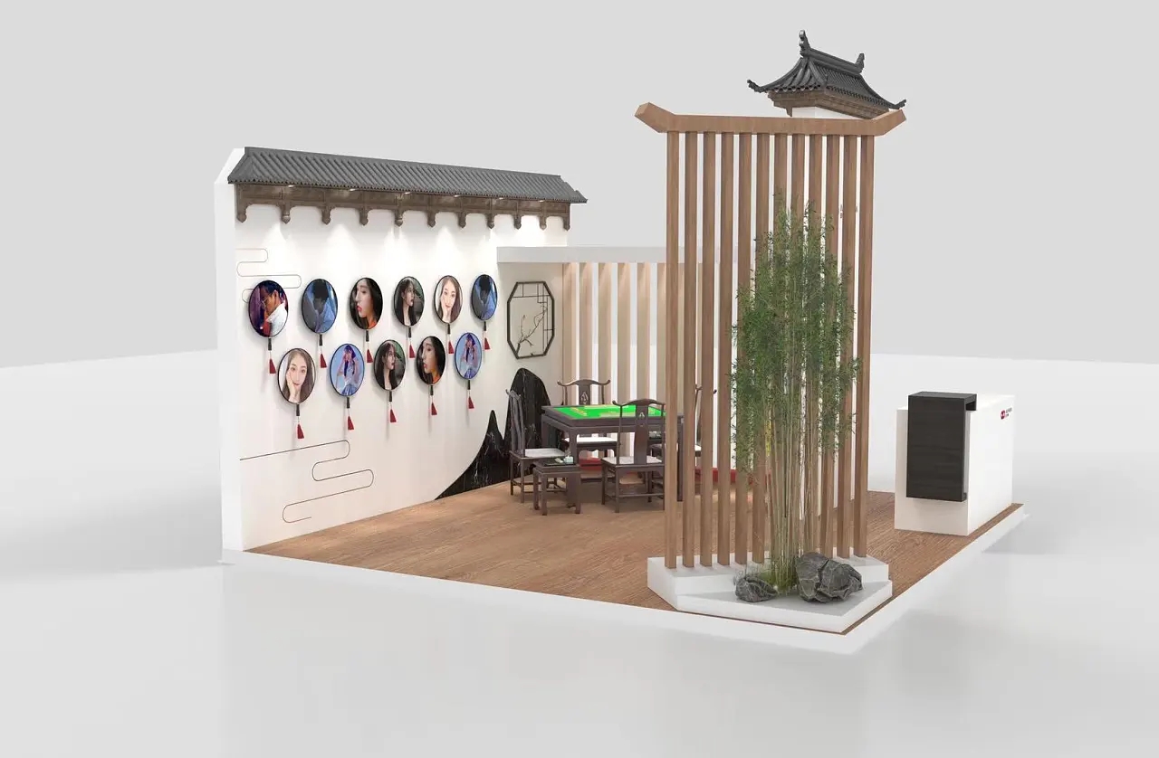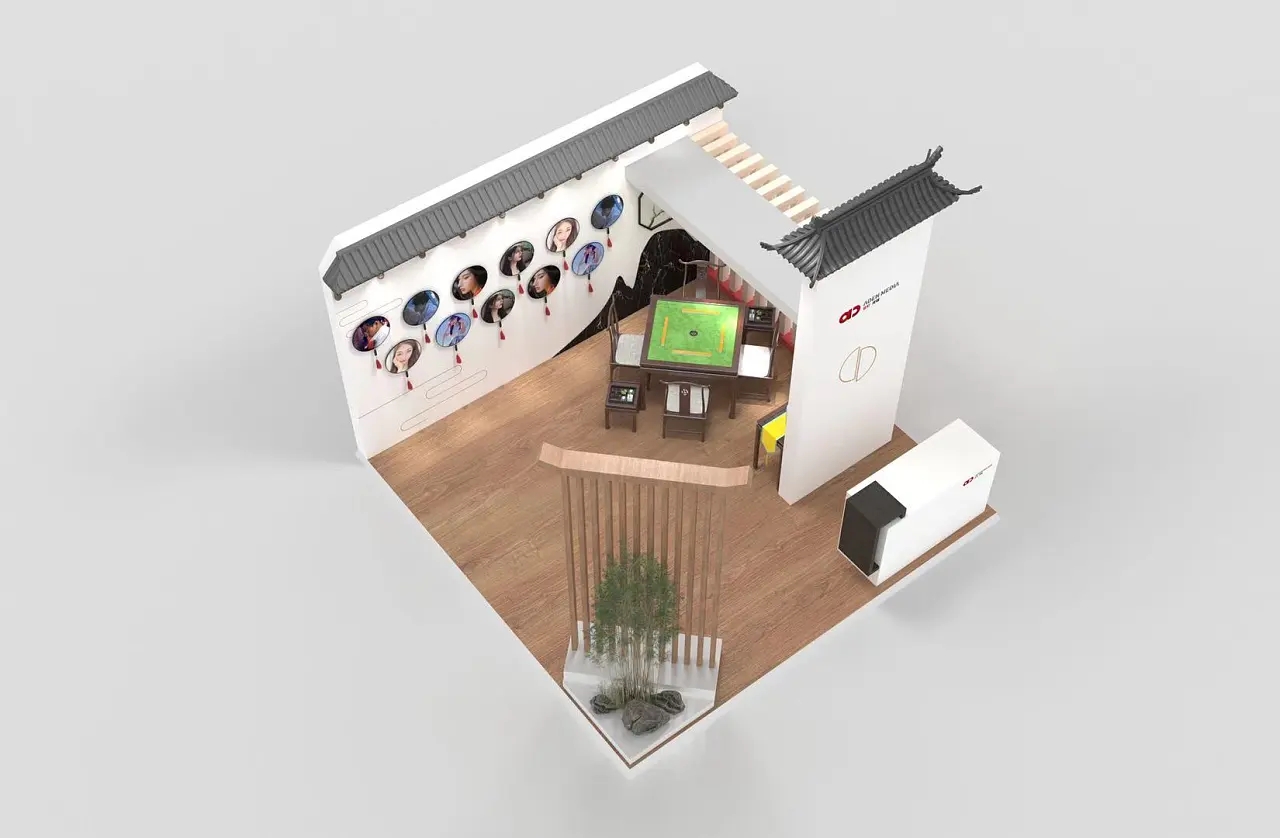 該展臺面積為36平方米的小展臺,采用了國風的建筑風格造型,使用了蘇式的墻面作為立面,在前方布置了木質屏風和綠植裝飾,展示出中式的園林一角的建筑風格,展臺內部空間布置了麻將桌與椅子,簡單有效的展示出該展臺的展示產品,墻面上的網紅頭像作為網紅打卡區也別具特色。成都展會公司-成都展示設計,會展設計公司,航峰會展公司是專注展臺搭建,展覽搭建,展示搭建,會展搭建等展覽設計搭建服務,連續多屆進博會展臺設計服務商,全球數百家會展主辦的指定搭建商,多年來為國內外五百強提供全球會展策劃,展覽設計,會展設計,展覽展示設計,展示設計,展會設計一站式服務。通過展覽制作,會展制作,展會制作,展臺制作,展示制作重塑展示,體驗,產業,運營四位一體新展覽之道,激發企業品牌創造力,實現品牌創意營銷全球化覆蓋。航峰成都展會公司是一家大型成都展示設計公司專業從事會展搭建設計,成都展示設計效果圖制作等展臺搭建設計服務,同時提成都會展設計公司效果圖等會展搭建設計效果圖,高端成都展示設計效果圖公司為企業提供搭建解決方案。