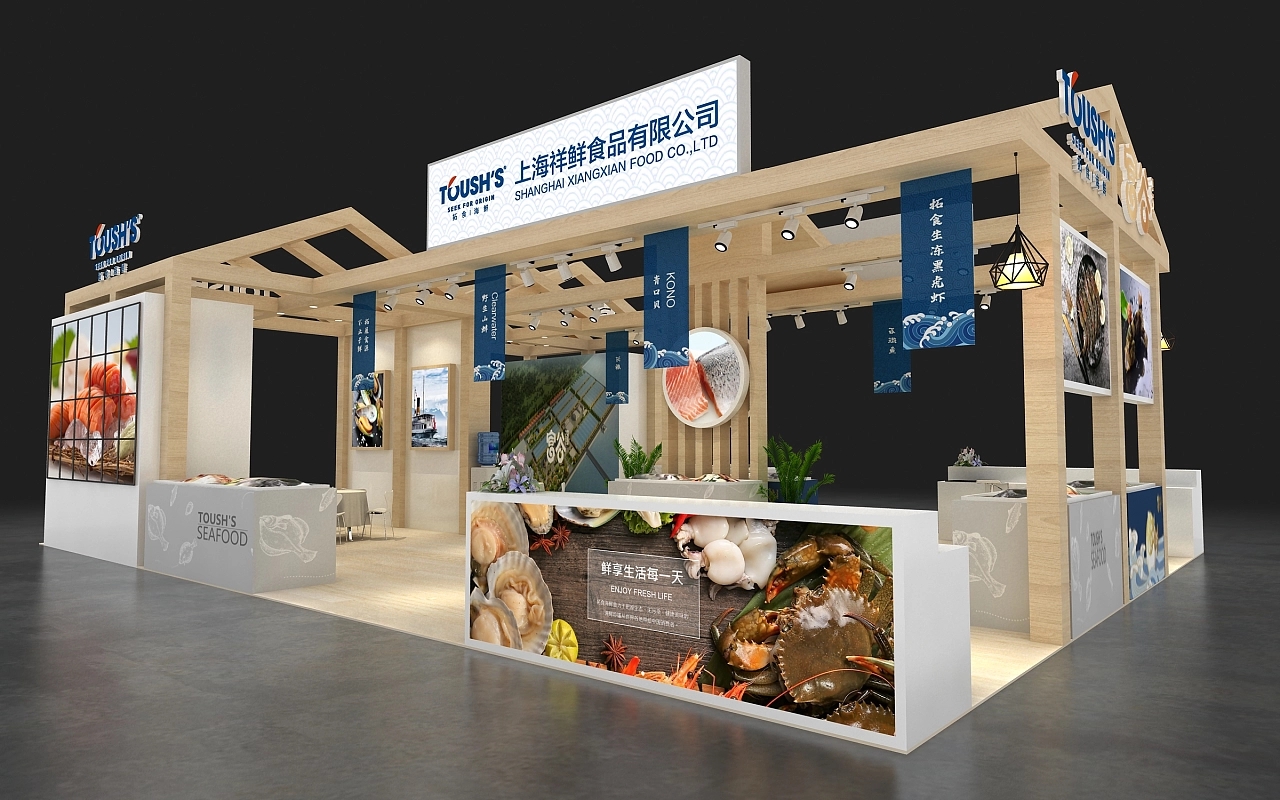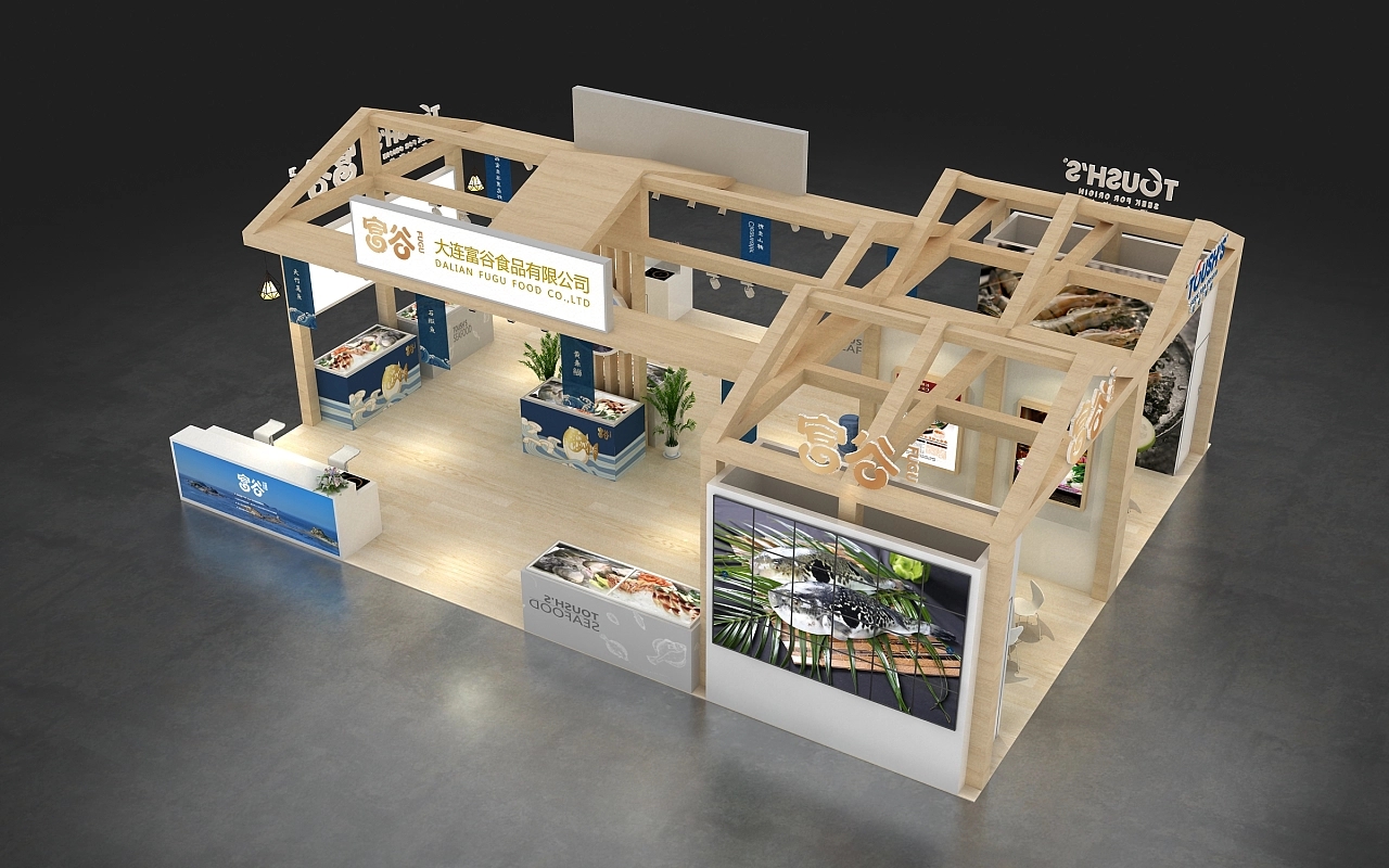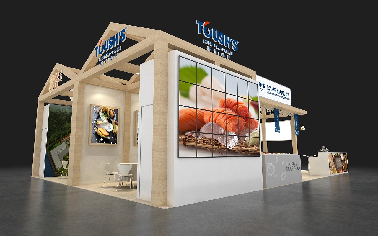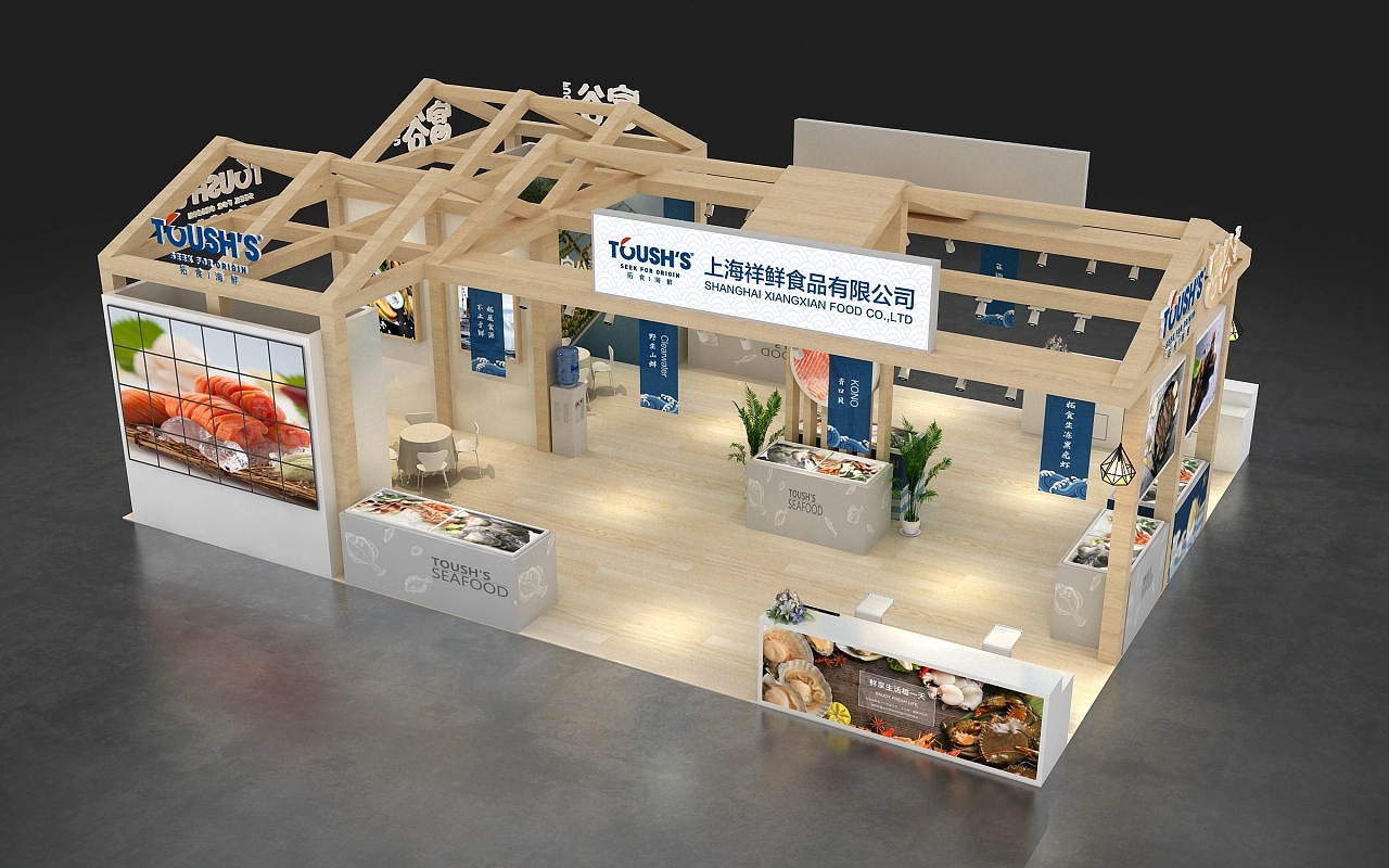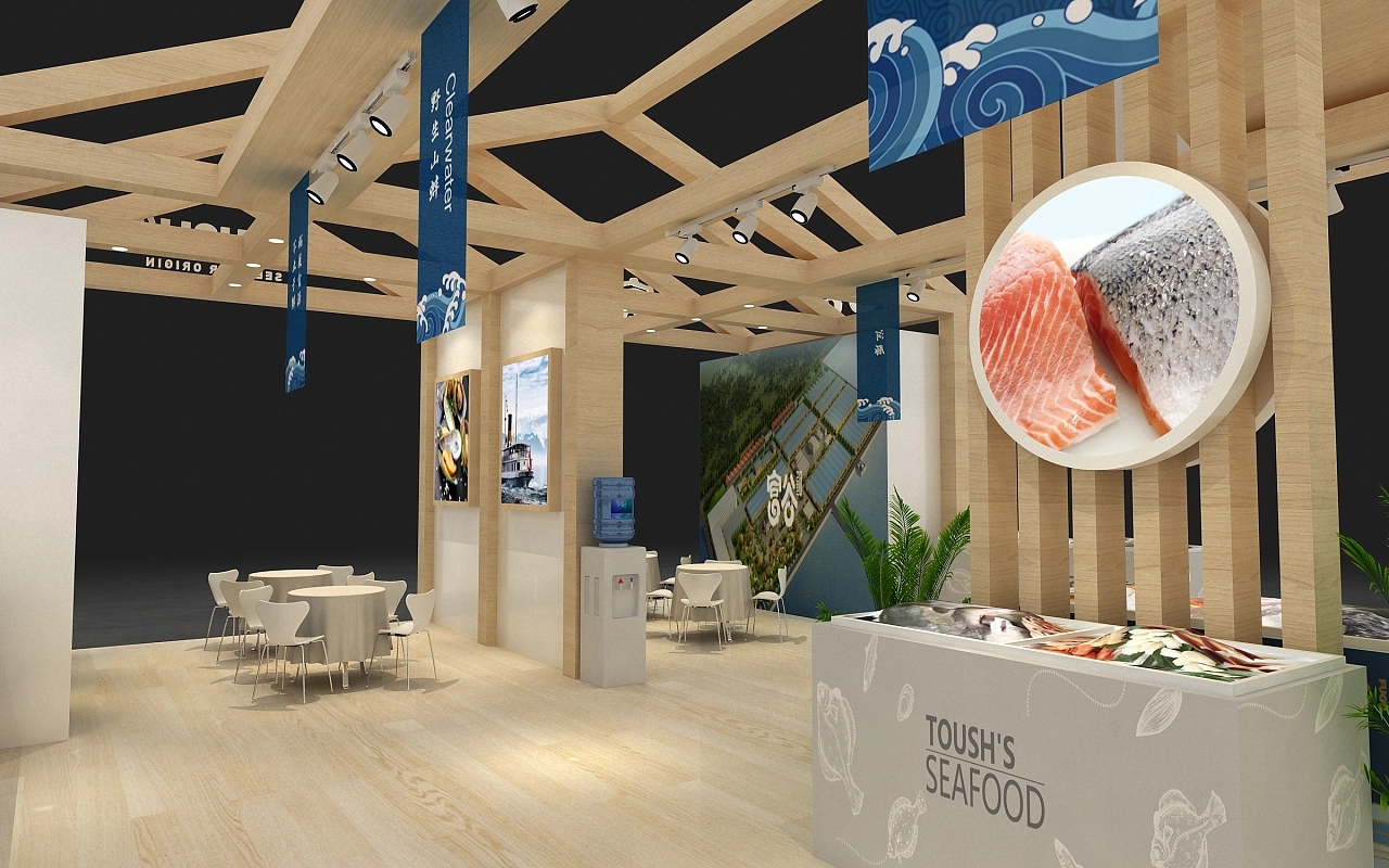 該展臺設計搭建融合了該企業產品的特色,用木結構進行施工搭建,整體造型為中式斜頂房屋,原木色的展臺展現出該企業產品綠色自然的特性,給參展觀眾溫馨舒適的空間氛圍感,展臺還布置了多個冰鮮展示柜,讓觀眾能更直觀清晰的了解該企業展示的展品。博覽會展示設計-博覽會展臺搭建,航峰會展公司是專注展臺搭建,展覽搭建,展示搭建,會展搭建等展覽設計搭建服務,連續多屆進博會展臺設計服務商,全球數百家會展主辦的指定搭建商,多年來為國內外五百強提供全球會展策劃,展覽設計,會展設計,展覽展示設計,展示設計,展會設計一站式服務。通過展覽制作,會展制作,展會制作,展臺制作,展示制作重塑展示,體驗,產業,運營四位一體新展覽之道,激發企業品牌創造力,實現品牌創意營銷全球化覆蓋。航峰博覽會展示設計公司是一家大型博覽會展臺搭建公司專業從事展示設計等展臺搭建服務,同時提供展示搭建效果圖等展臺設計效果圖,高端博覽會展示設計為企業提供搭建解決方案。