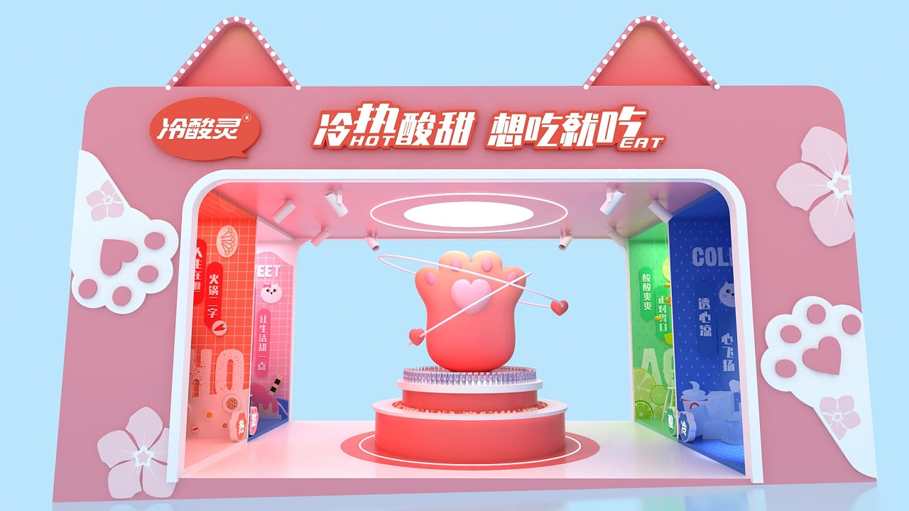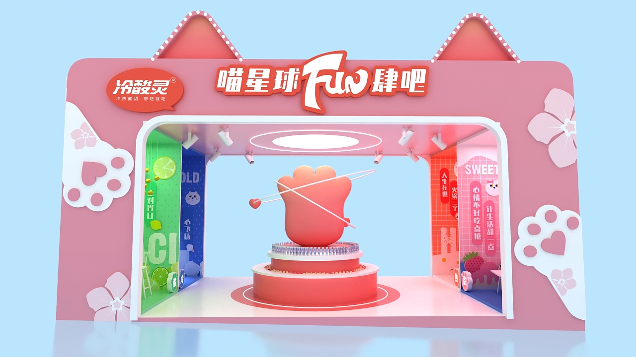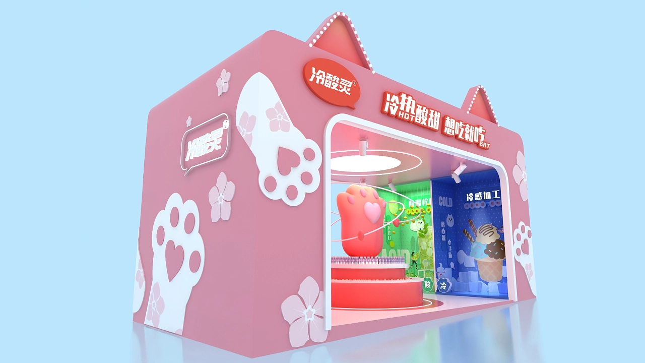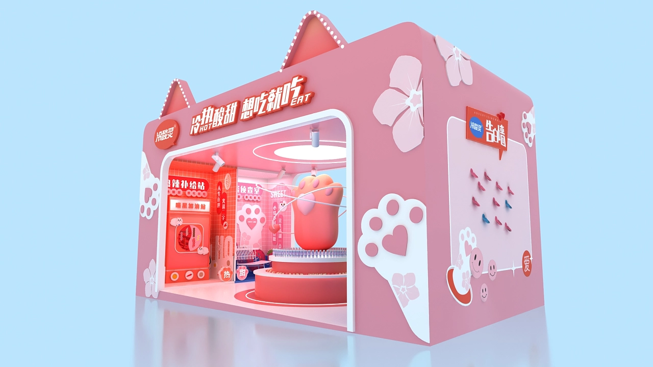 該展位設計方案采用了粉色作為展臺設計搭建的主色彩,以貓為造型的亮點進行打造,方形的外墻上是一對貓耳,中間展示臺上是一個可愛的貓爪,整個展臺設計氛圍十分的活潑可愛,充滿元氣,體現出積極樂觀的生活態度,契合了該企業“冷熱酸甜,想愛就愛”的產品文化主題。空間展示設計-高端展示空間設計公司,航峰會展公司是專注展臺搭建,展覽搭建,展示搭建,會展搭建等展覽設計搭建服務,連續多屆進博會展臺設計服務商,全球數百家會展主辦的指定搭建商,多年來為國內外五百強提供全球會展策劃,展覽設計,會展設計,展覽展示設計,展示設計,展會設計一站式服務。通過展覽制作,會展制作,展會制作,展臺制作,展示制作重塑展示,體驗,產業,運營四位一體新展覽之道,激發企業品牌創造力,實現品牌創意營銷全球化覆蓋。航峰空間展示設計公司是一家大型空間展示設計專業從事空間展示設計等會展搭建服務,同時提空間展示設計效果圖等會展設計效果圖,高端空間展示設計為企業提供搭建解決方案。